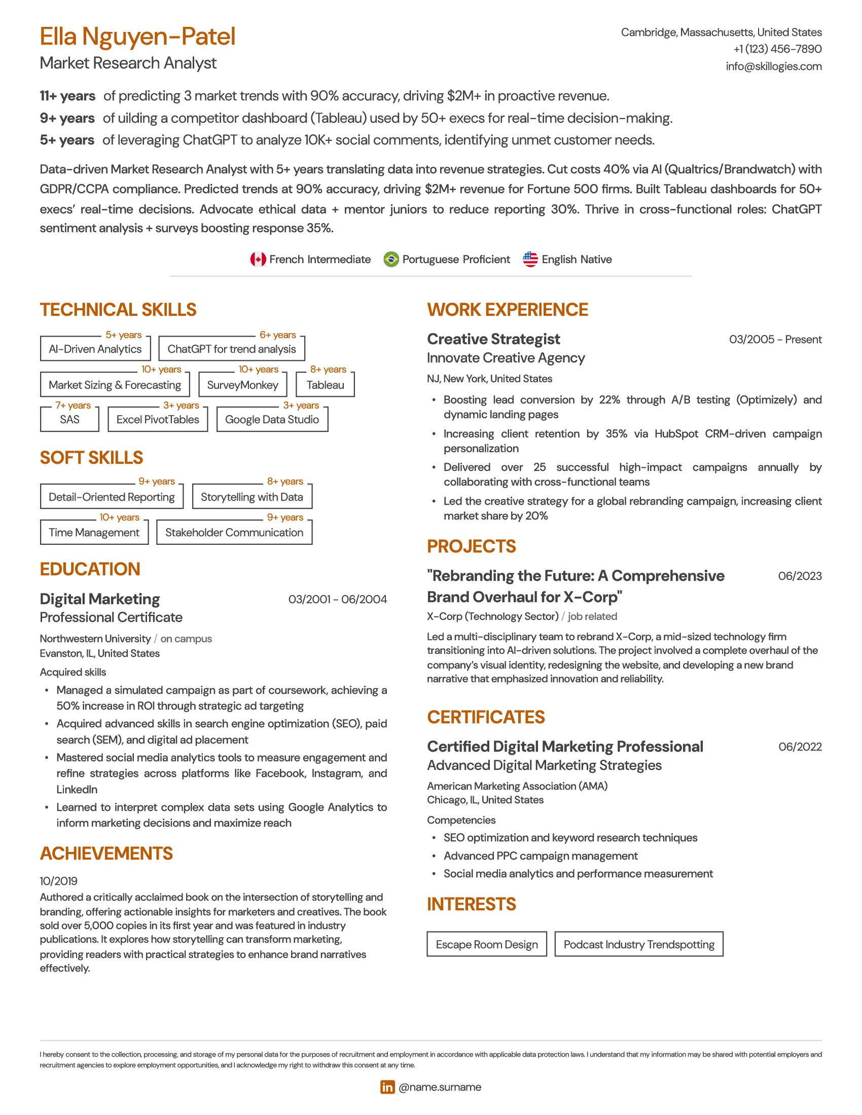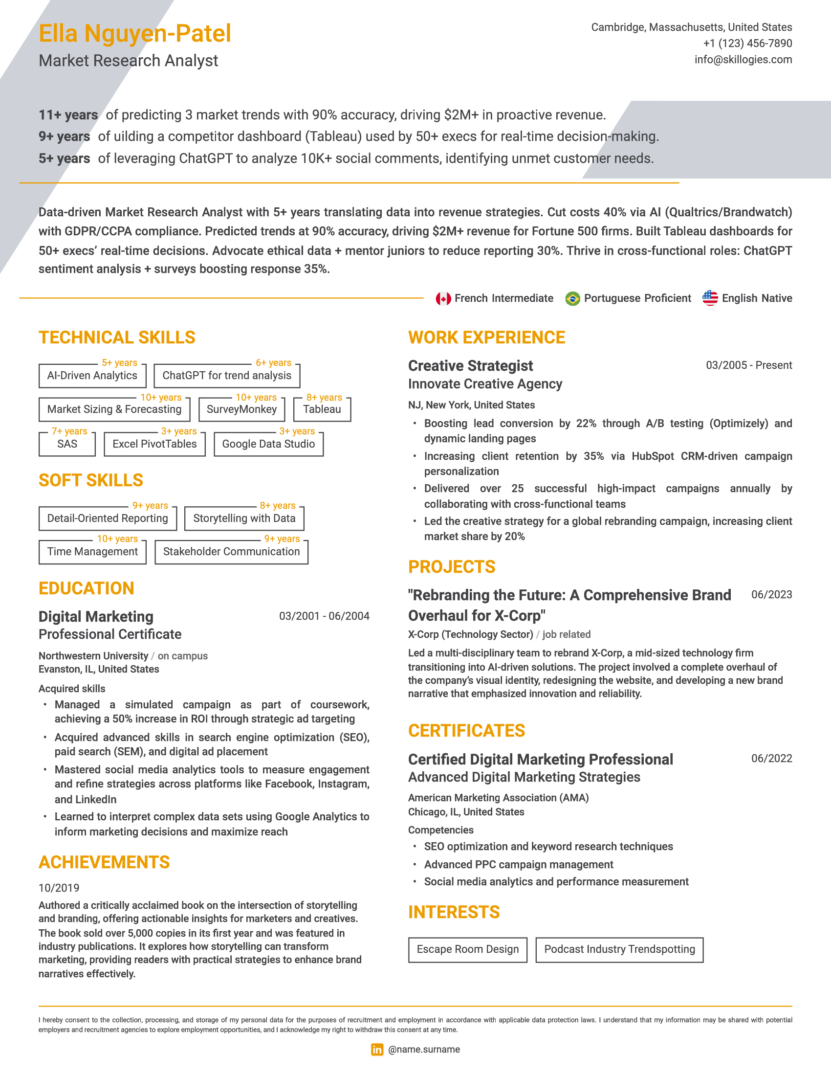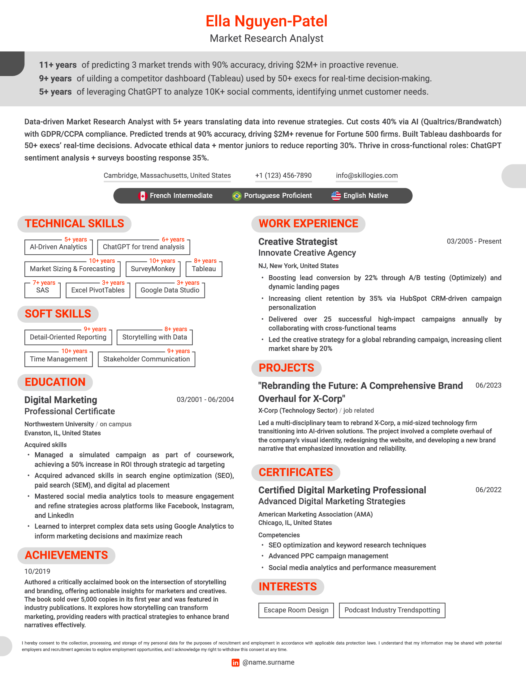 Present your foreign language proficiency levels in a visible and easily accessible spot on your resume for quick reference. Language skills are often a key factor in recruitment decisions, particularly for roles requiring international collaboration or communication. Ensuring they are prominently displayed will help recruiters quickly assess your qualifications and suitability for the role, giving you a competitive edge in the hiring process