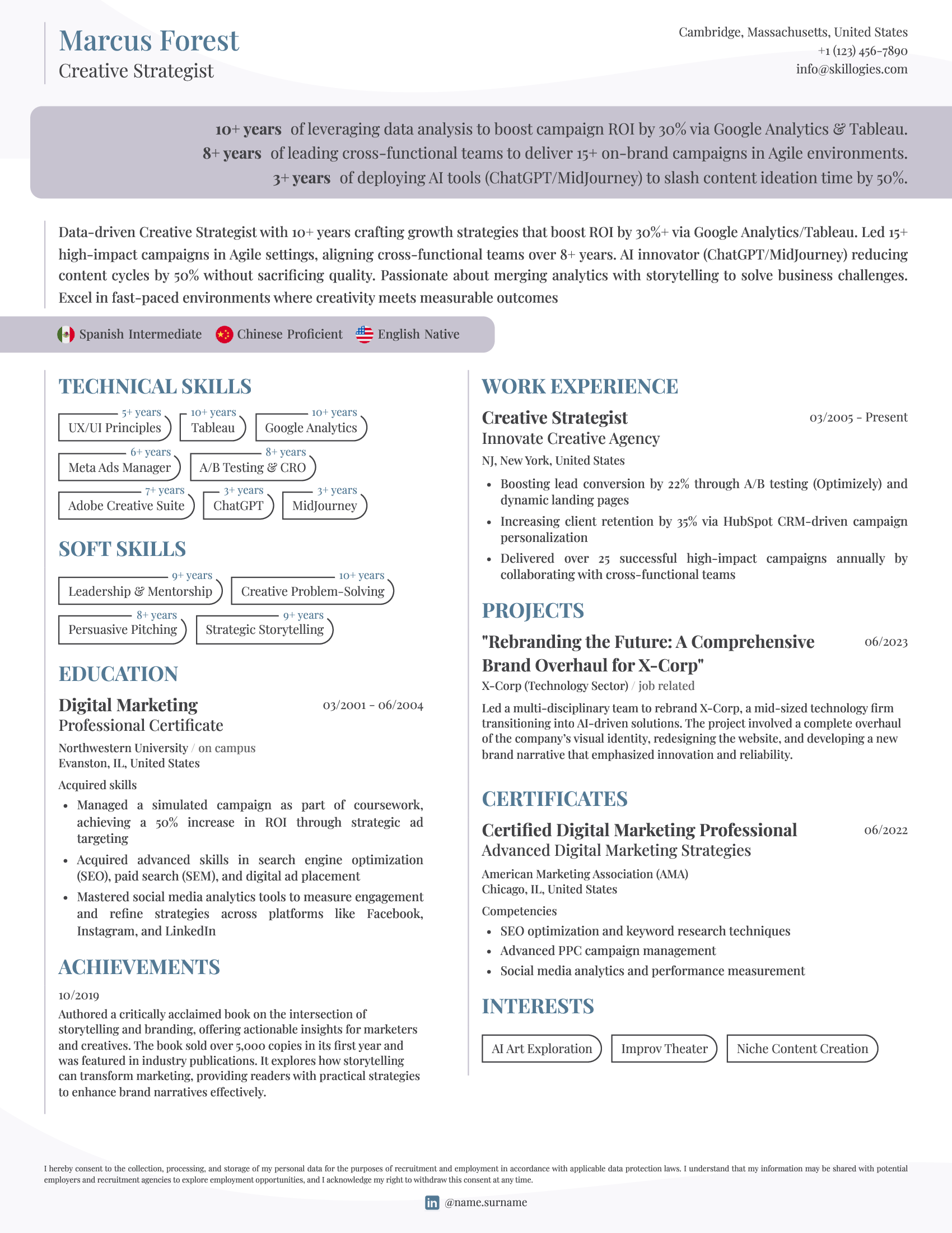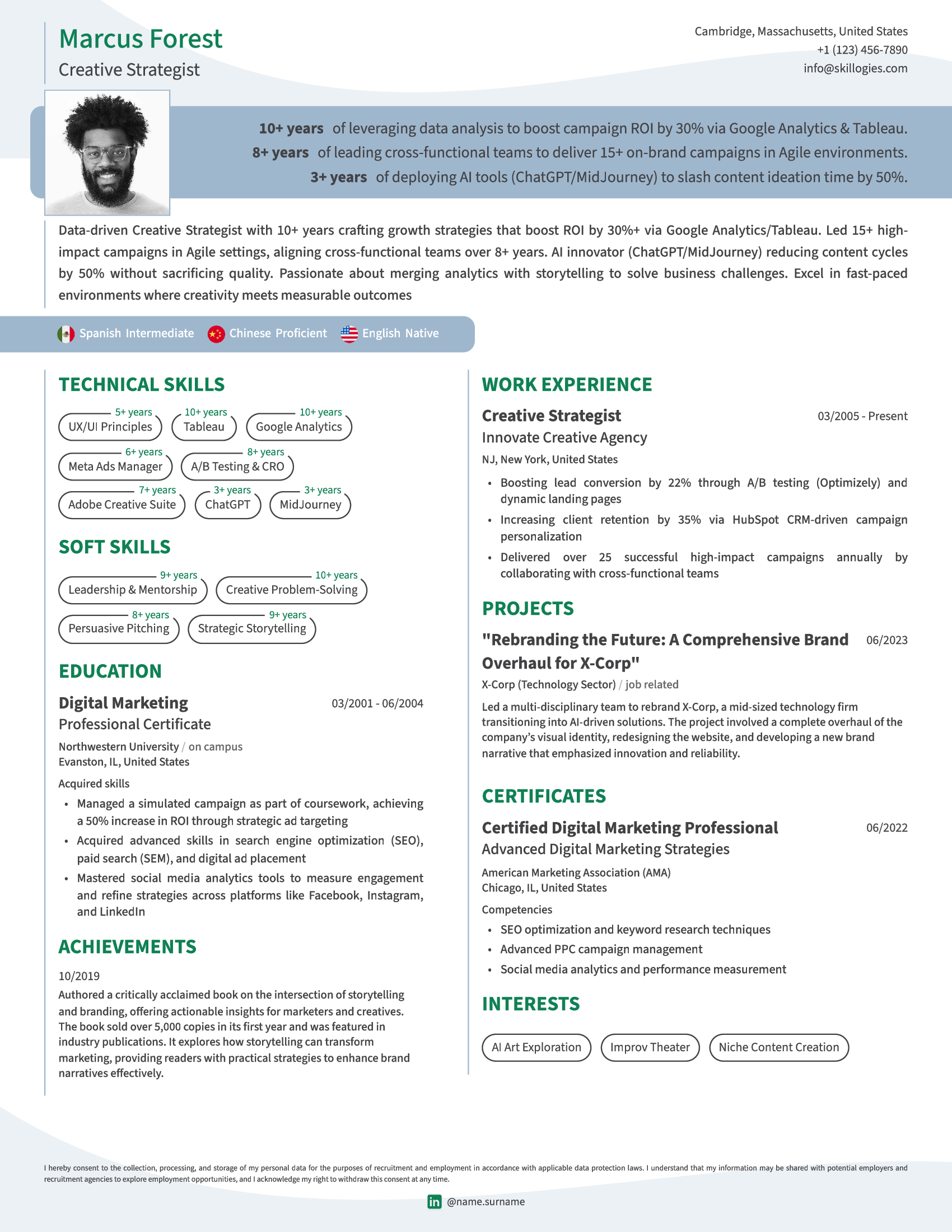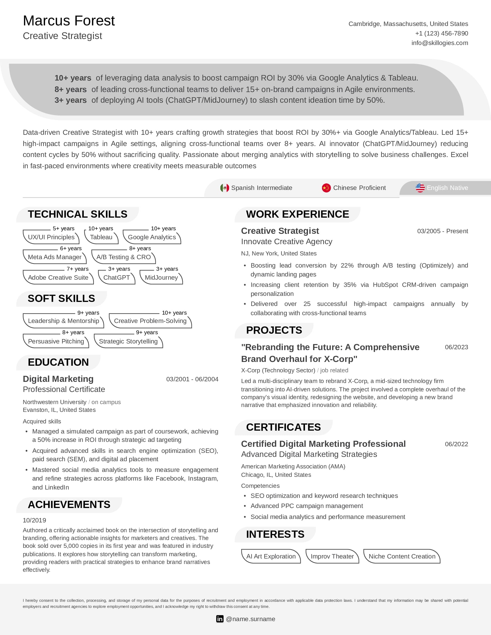 Make your skills stand out by presenting the years of experience for each, as this increases your chances of passing ATS screening and catching the eye of recruiters. With customizable design elements, you can craft a professional, visually appealing profile that maximizes your chances of leaving a lasting positive impression