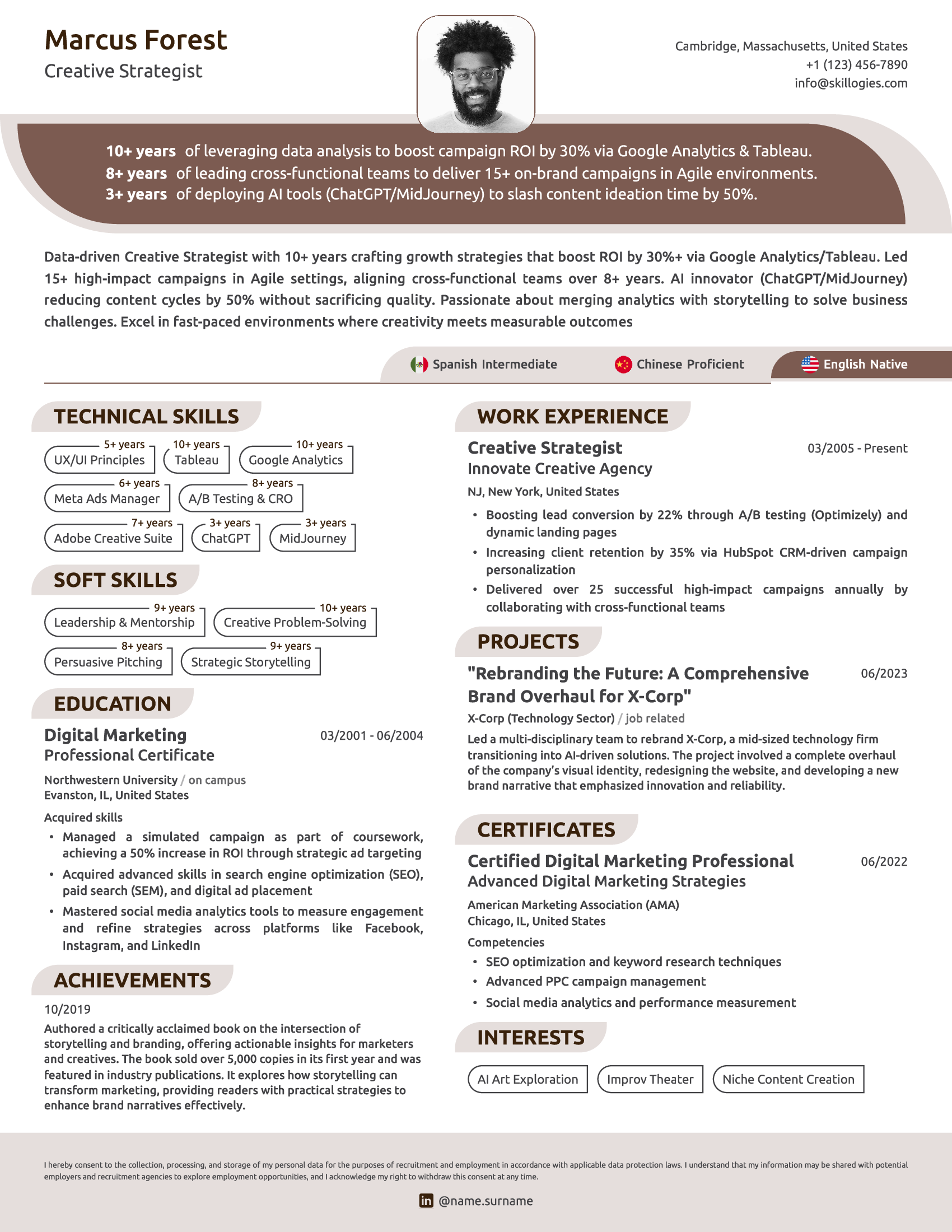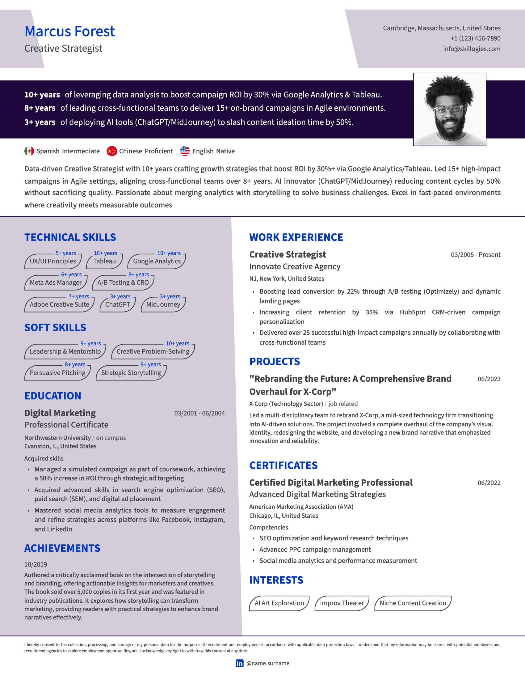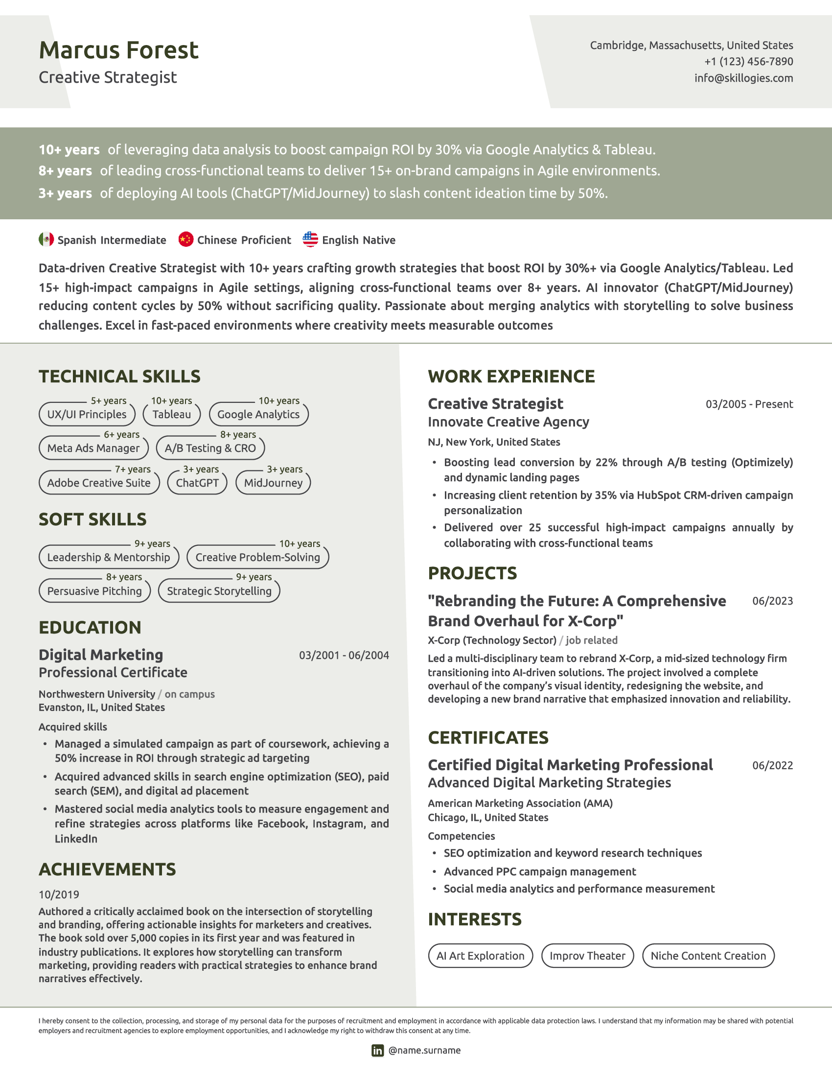 Make your skills stand out by presenting the years of experience for each, as this increases your chances of passing ATS screening and catching the eye of recruiters. With customizable design elements, you can craft a professional, visually appealing profile that maximizes your chances of leaving a lasting positive impression